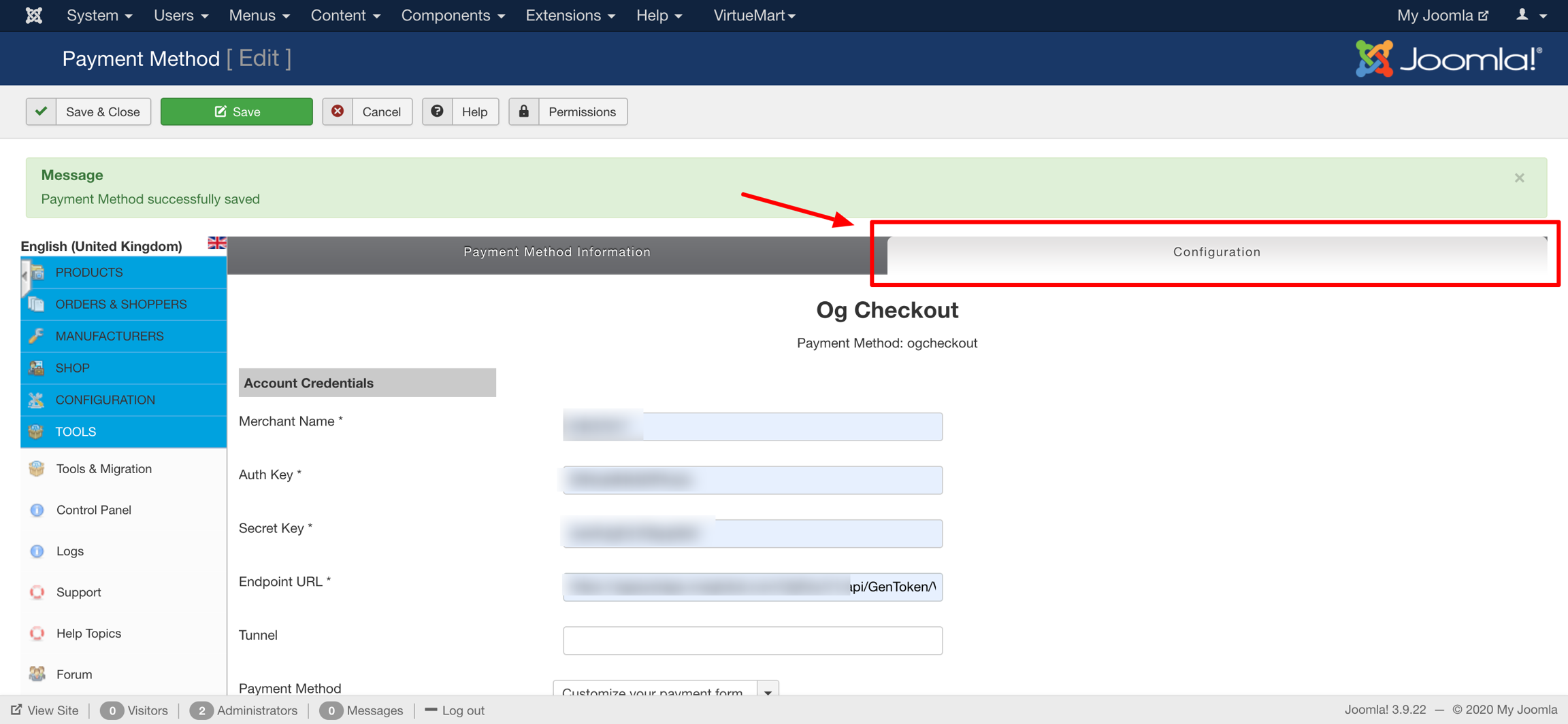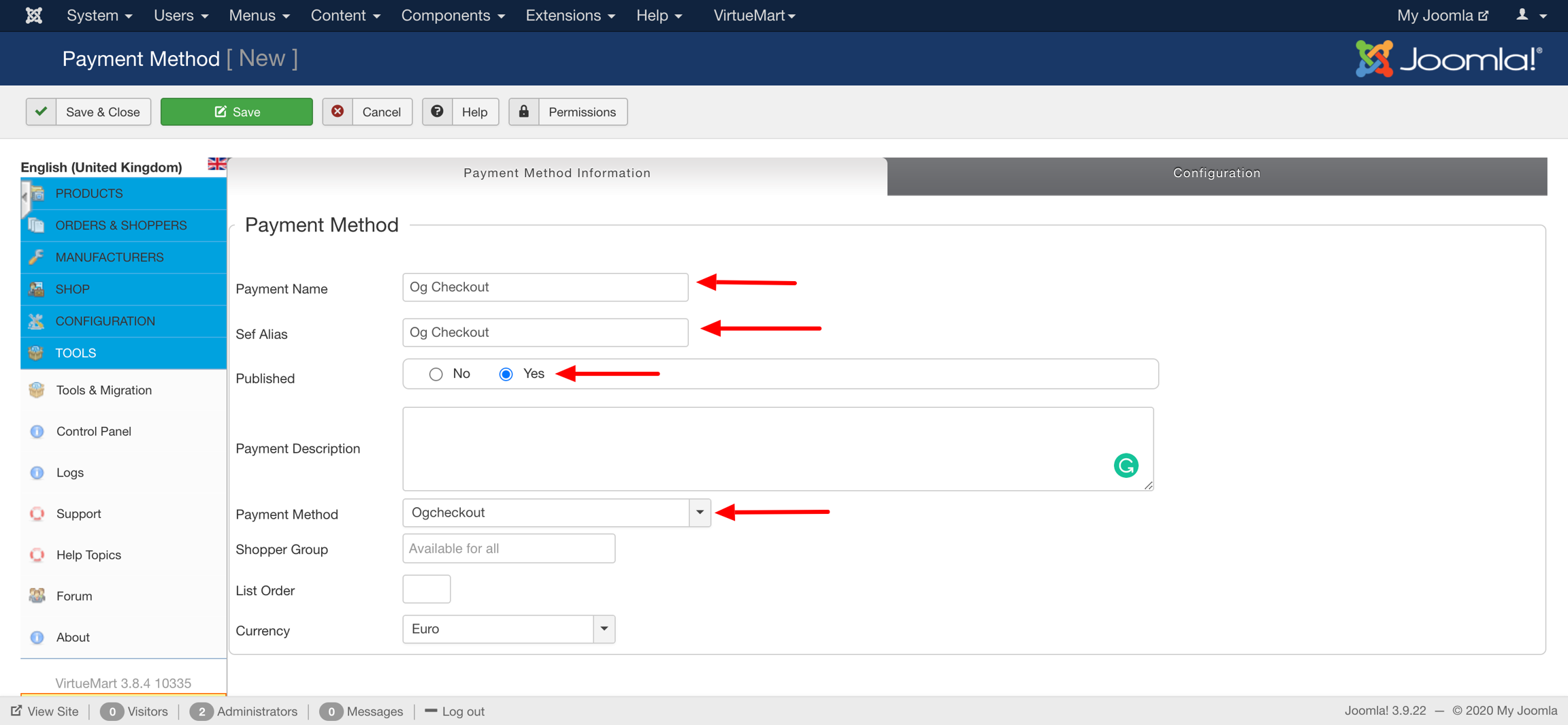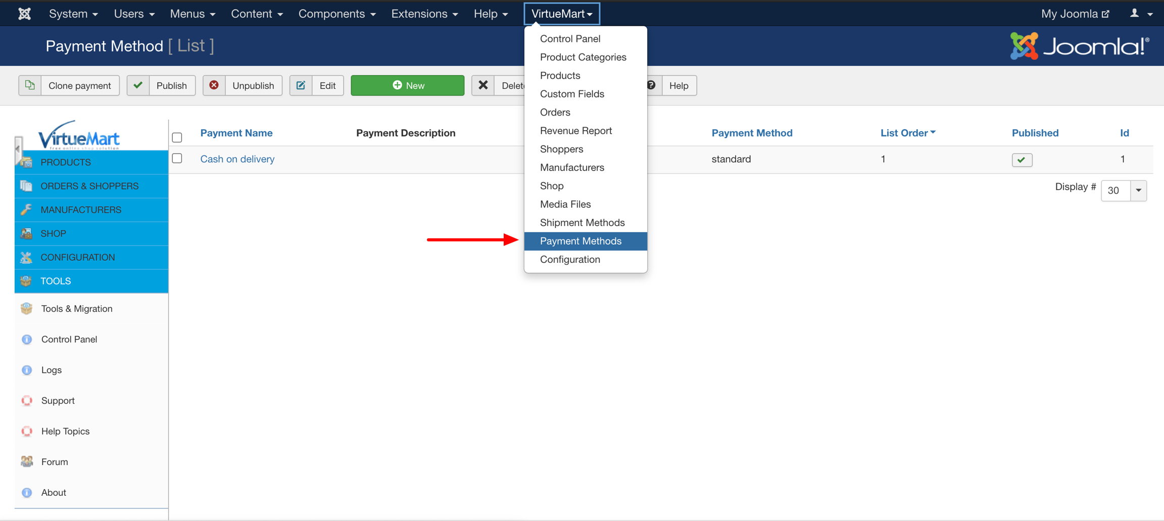 Go to VirtueMart -> Payment Methods